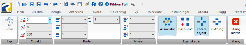 När du valt kommandot ska du välja vilket/vilka objekt som du vill kopiera. När alla objekten är markerade bekräftar du som vanligt med Enter. Nästa steg är att markera centrumpunkten för din matris. När det är gjort kommer nedanstående Ribbon upp där du kan göra alla inställningar som du vill ha och du ser direkt på ritningen hur matrisen kommer att se ut.