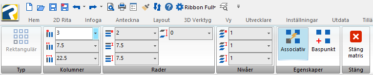 Matriskommandot i progeCAD har under senare år fått en tydlig och modern hantering. Funktionerna arbetar idag med en dynamisk Ribbon som visas när du skapar eller redigerar matriser. Det gör att du ser resultatet i realtid och kan justera alla inställningar direkt i ritningen.
